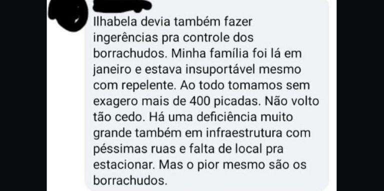 E uma postagem na página do Facebook Ilhabela SP LT nesta segunda-feira (23) colocou mais lenha na fogueira desse antigo perrengue. No post era possível ver um print de um comentário de um turista relatando que ele e a família estiveram em Ilhabela em janeiro e que, pelo visto, serviram de almoço para borrachudos, mesmo com o uso de repelentes. “Ao todo, tomamos, sem exagero, mais de 400 picadas”, relatou o autor do comentário, que também disse que não volta tão cedo à cidade.