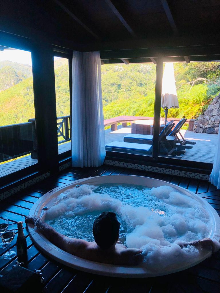 A hidromassagem para casal tem vista para as montanhas, graças às paredes que possuem generosos vidros, que permitem uma visão única da serra. Aproveite e abra um espumante Chandon, já disponível no frigobar, para celebrar ao lado da pessoa amada esse momento que certamente ficará marcado eternamente.