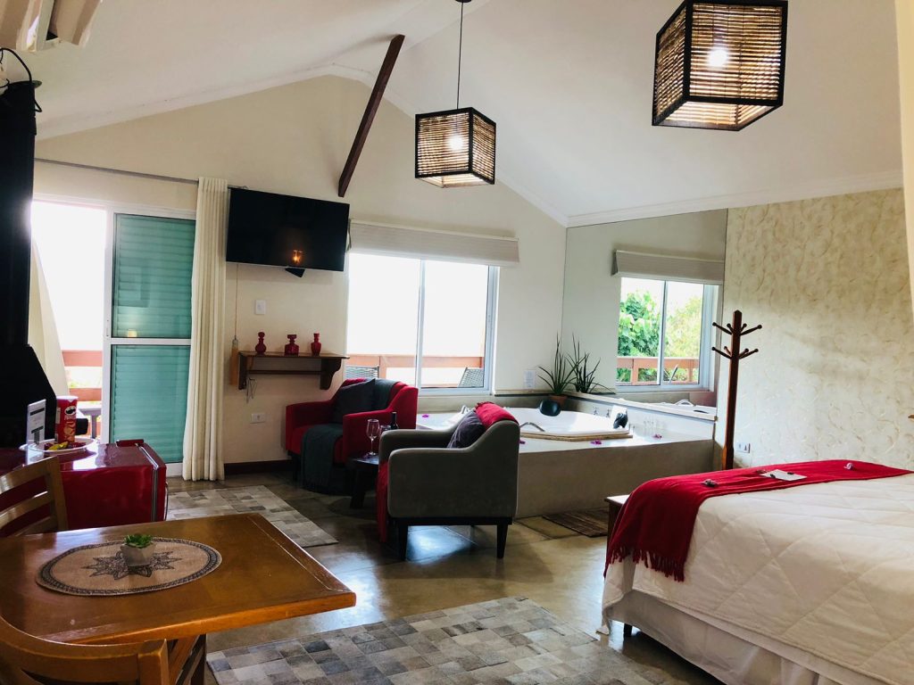 O ambiente rústico misturado com o luxo torna o ambiente harmonioso e ainda mais romântico, principalmente se o casal degustar um dos vinhos da adega da pousada, em frente à lareira.