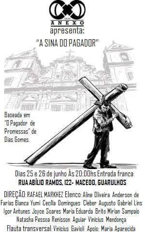 O grupo Anexo se apresentará na região do Macedo nos dias 25 e 26 junho com a peça “A Sina do Pagador”, baseado em o “O Pagador de Promessas”, de Dias Gomes, a direção da peça é de Rafael Marquez.