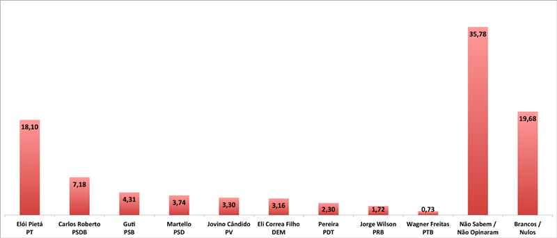 O tucano Carlos Roberto vem em seguida com 6,75%, seguido de Guti (PSB) com 6,47%, Jovino Cândido (PV) com 3,64%, Jorge Wilson (PRB) com 3,30%, Wagner Freitas (PTB) com 2,84% e Pereira (PDT) com 1,71%.