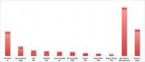 O tucano Carlos Roberto vem em seguida com 6,75%, seguido de Guti (PSB) com 6,47%, Jovino Cândido (PV) com 3,64%, Jorge Wilson (PRB) com 3,30%, Wagner Freitas (PTB) com 2,84% e Pereira (PDT) com 1,71%.