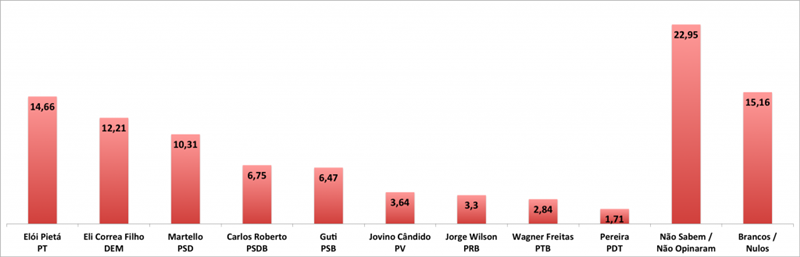 Na resposta da pergunta “Se a eleições fosse hoje, em qual desses candidatos você não votaria para prefeito?”, Jovino Cândido (PV) surge com 3,30%; Eli Corrêa Filho (DEM), com 3,16; Pereira (PDT), com 2,30%; Jorge Wilson (PRB), com 1,72%; e Wagner Freitas (PTB), com 0,73. Não sabem ou não opinaram, somaram 35,78%, e brancos e nulos, 19,68%.