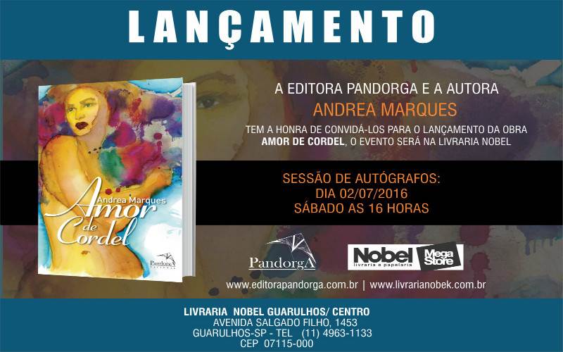 A autora Andrea Marques, 40 anos, lança neste sábado, 02, na Livraria Nobel, localizada dentro do Shopping Maia, a partir das 16h, o livro Amor de Cordel, uma história baseada de vida de seus antigos pacientes, já que Andrea é formada pela Universidade Federal de São Carlos em Terapia Ocupacional, e durante 15 anos trabalhou em clínicas de reabilitação e hospitais atendendo pessoas com sequelas neurológicas e ortopédicas.