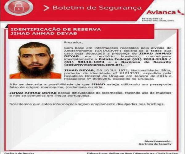 A companhia aérea Avianca, lançou um comunicado na última sexta-feira, 1, sobre uma possível fuga de um terrorista de origem síria ao Brasil. O nome dele é Jihad Ahmad Deyab, e segundo informações da companhia, ele seria ex-presidiário de Guantánamo, além de ser acolhido pelo Uruguai como refugiado no país, porém, está foragido há duas semanas.