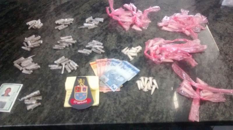 Os policiais militares estavam em patrulhamento pela rua Guilherme Stradiote, no Jardim Lenize, quando avistaram em atitude suspeita um homem, que ao perceber a aproximação da viatura, começou a correr em direção a mata, acompanhado de um amigo. A fuga não deu certo, e a polícia conseguiu abordá-lo, encontrando em sua posse, dentro da calça, uma sacola plástica transparente contendo 96 trouxinhas de maconha e 54 pinos de cocaína, além de R$ 51,00.