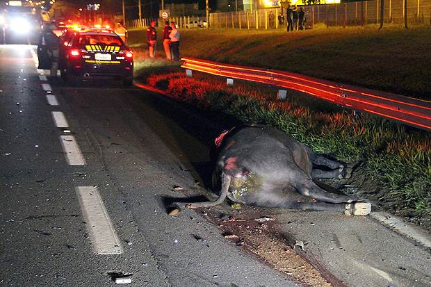 De acordo com a Polícia Rodoviária Federal, o animal acessou a rodovia e trafegava contra o fluxo na faixa da esquerda, quando foi atingido por um VW Golf. Outro veículo bateu na traseira do Golf, perdeu o controle e capotou.