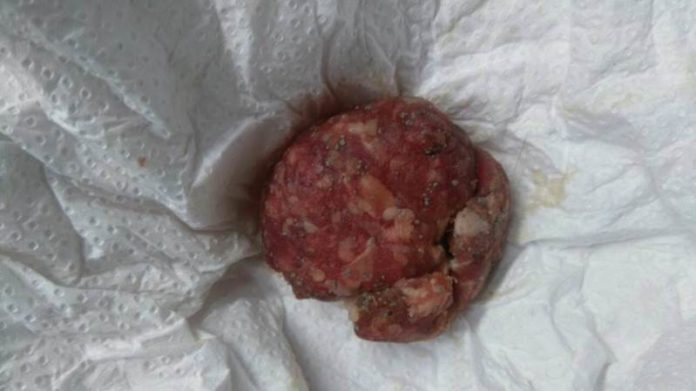 Diversas bolinhas de carne moída se espalharam nos portões das residências da rua Caramuru. Segundo os moradores, quando os cachorros comem essa carne moída, eles não conseguem se manter em pé e começam a vomitar.