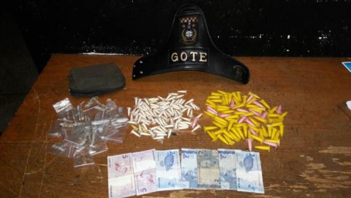 Com os três indivíduos, um do sexo feminino, e dois do sexo masculino, foram encontrados 30 trouxinhas de maconha, 170 epprendorfs de cocaína, R$ 20, além de celular utilizado para a comunicação no comércio de drogas. Os policiais encaminharam os três para o 4° DP, porém, um continua preso, pois já problemas com a justiça pelo mesmo crime.