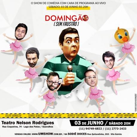 O teatro Nelson Rodrigues recebe neste sábado (3), o show de comédia Domingão sem Faustão, às 20h. O show terá apresentação de humoristas como Felipe Hamachi, Fábio Guere, Daniel Pinheiro, Renato Tortorelli e Tomas Kenedi. Os ingressos estã ono valor de R$ 20, mais R$ 2 da taxa de serviço, saiba mais informações: