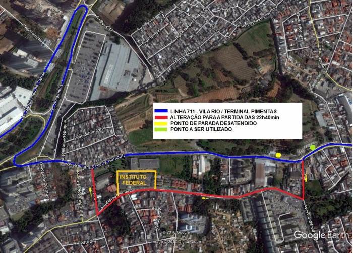 A partir da próxima segunda-feira (12), a Secretaria de Transportes e Trânsito irá alterar o trajeto da linha 711 – Vila Rio de Janeiro/Terminal Pimentas para facilitar o acesso dos estudantes do Instituto Federal de Educação, na saída noturna. A alteração ocorrerá exclusivamente na viagem das 22h40, com partida da Vila Rio de Janeiro, quando o ônibus pegará a avenida Salgado Filho pela avenida Rio de Janeiro, passará em frente ao estabelecimento de ensino e depois retornará à avenida Benjamim Harris Hanicutti pela rua Lions.