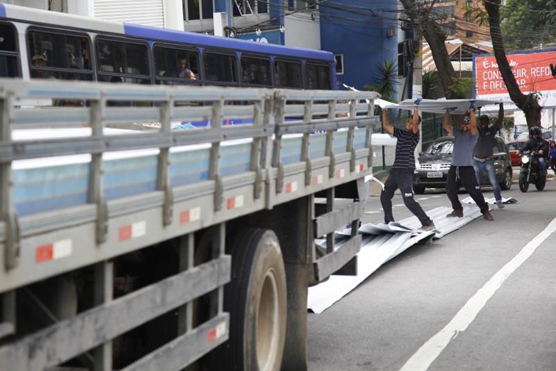 O carregamento caiu por volta das 10h30, mas três trabalhadores já estavam retirando todas as telhas no local.