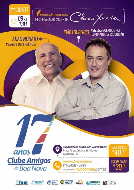 Na data de celebração do Dia Internacional da Amizade, 30 de julho, o Clube Amigos da Boa Nova, da Fundação Espírita André Luiz, realizará sua festa de aniversário de 17 anos do Clube Amigos da Boa Nova.