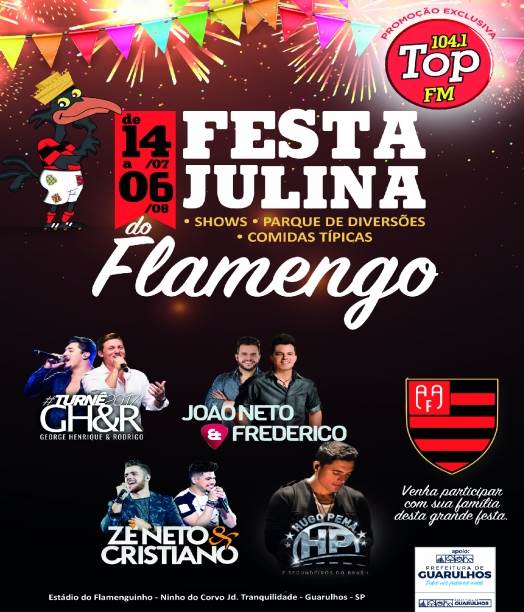 A primeira Festa Julina da Associação Atlética Flamengo de Guarulhos terá diversas atrações, entre elas, o show da dupla Zé Neto e Cristiano, além de João Neto e Frederico, George Henrique e Rodrigo, Hugo Pena e todos os domingos, a festa será comandada pelo cantor Victor Guedes.