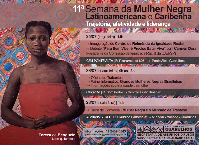 Com o tema Trajetória, Afetividade e Liderança, a 11a. Semana da Mulher Negra Latinoamericana e Caribenha de Guarulhos contará com atividades culturais, debates e inauguração do Centro de Referência da Igualdade Racial, que acontecerá no dia 25/07 (terça-feira), às 14h, no CEU Ponte Alta, localizado na Rua Pernambuco 826 – Jd. Ponte Alta – Guarulhos/SP.