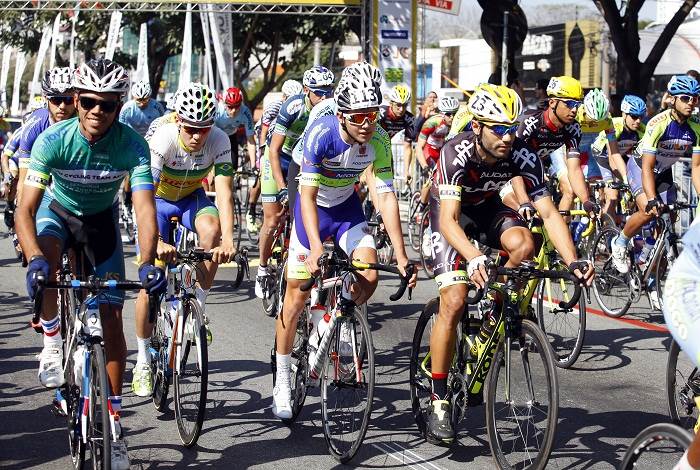 Pelotão de ciclistas que participam da Volta Ciclística Internacional de Guarulhos está na altura do km 32 da rodovia Ayrton Senna, sentido São Paulo. O comboio de veículos está entre o km 54 e o km 49 da via, no mesmo sentido.