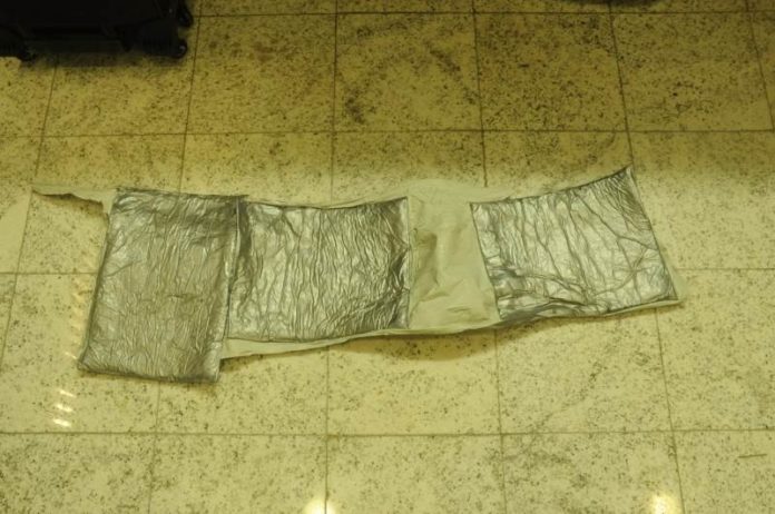 A mulher, uma sul-africana de 31 anos de idade, foi conduzida à delegacia para retirada dos volumes suspeitos e realização de perícia no material. Os exames periciais preliminares identificaram que a substância encontrada era cocaína, cujo peso bruto somou mais de 3 Kg. A mulher recebeu voz de prisão.