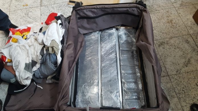 Servidores da Receita Federal, que atuam nos canais alfandegários, selecionaram um brasileiro que desembarcou de voo procedente de Milão, na Itália, para verificação do conteúdo de sua bagagem. O homem havia escolhido o canal “nada a declarar” e, ao passar as malas do passageiro pelo raio-x, as imagens indicaram a existência de volumes contendo substância orgânica em suas estruturas. A Polícia Federal foi acionada e conduziu o homem e seus pertences à delegacia para que, na presença de testemunhas, fossem realizados os exames periciais. Os peritos federais localizaram mais de 7 Kg de haxixe ocultos nas estruturas da mala, protegidos por uma placa de madeira compensada. O passageiro recebeu voz de prisão e confessou aos policiais que receberia uma quantia em euros pelo transporte da mala, que seria entregue em São Paulo a uma pessoa desconhecida.
