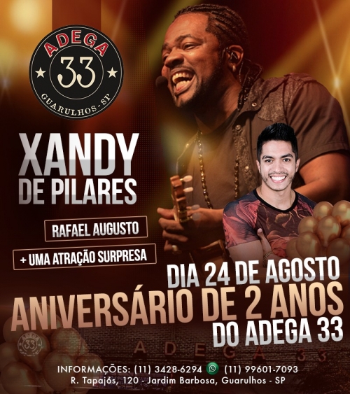 Um dos bares mais tradicionais da cidade, o Adega 33, comemora o aniversário de dois anos, com um grande show no próximo dia 24 (quinta-feira), a partir das 17h. Entre as atrações, estão a presença do cantor Rafael Augusto e Xande de Pilares, além de uma novidade que será divulgada apenas no dia da festa.