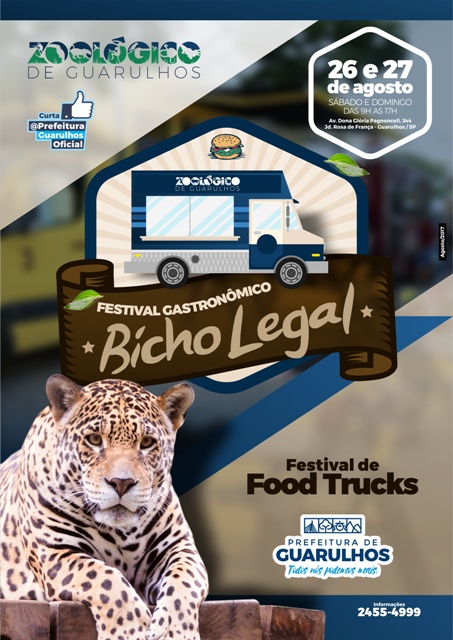 Neste sábado e domingo (26 e 27), o Zoológico de Guarulhos recebe o festival gastronômico Bicho Legal. Das 9h às 17h, food trucks estarão distribuídos pelo zoo, com diversas opções de lanches e refeições. Entre os participantes estão Monster Burger, Trem Bão-Porções, Ladies Burger, Espeto de Prata e Delícia de Tapioca.