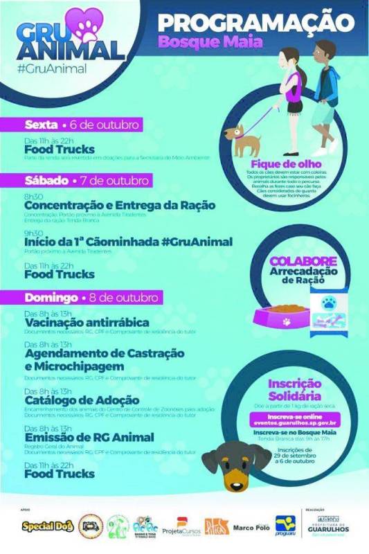 Já no sábado, das 9h30 às 11h30, acontece a Cãominhada. O passeio será realizado na avenida Paulo Faccini, com início no cruzamento com a avenida Tiradentes e término na altura da entrada principal do Bosque Maia (tenda branca), onde diversos food trucks estarão à disposição. As inscrições são gratuitas e devem ser realizadas pelo portal eventos.guarulhos.sp.gov.br. Todos os cães devem estar com coleiras e os proprietários são responsáveis pelos animais durante todo o percurso. Além disso, cães considerados de guarda devem usar focinheiras.