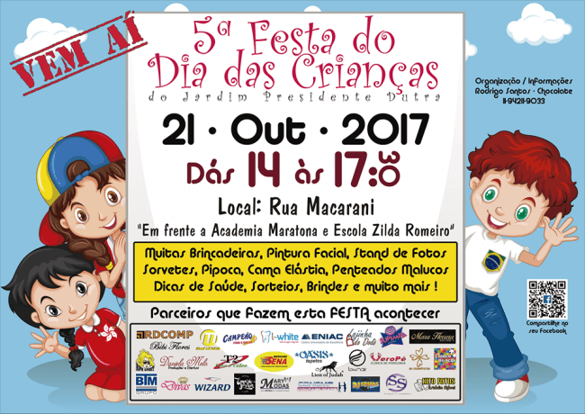 Alegria e a energia de ser criança, é baseado nessas palavras que neste sábado (21), a partir das 14h, começa mais uma edição da 5° Festa do Dia das Crianças, que será realizada na rua Macarani, no Jardim Presidente Dutra, na altura do número 415, próximo a Escola Estadual Zilda Romeiro Pinto Moreira da Silva.