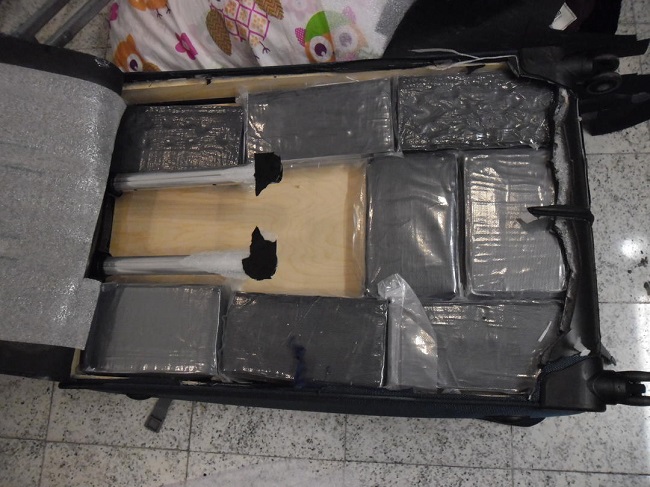 As suspeitas embarcariam no mesmo voo mas seguiriam para destinos diferentes. Elas foram abordadas e entrevistadas pelos policiais federais na fila do check-in. Na primeira abordagem os policiais desconfiaram das respostas dadas pela passageira, possuidora de passaporte italiano, que pretendia embarcar com destino a Portugal. A mulher disse aos policiais ser paraguaia e que mora na Alemanha. Ela contou que teria vindo ao Brasil para passar o carnaval. No porão de bagagens, as malas da passageira, que já haviam sido despachadas, foram separadas e submetidas ao aparelho de raio-x, revelando a existência de substância suspeita nas estruturas de uma delas. A passageira, 55 anos, foi conduzida à delegacia e recebeu voz de prisão após os peritos federais identificarem a substância como cocaína, cujo volume total somou oito quilos. A droga estava oculta e embalada em oito tabletes dentro de um fundo falso feito de madeira.