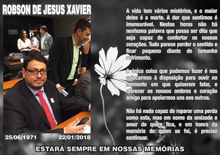 Robson de Jesus Xavier faleceu na noite do último dia 22 de janeiro, após passar mal em um estabelecimento comercial e sofrer uma queda. Ele havia acabado de deixar uma reunião em pleno domingo, quando tratou de assunto de interesses dos taxistas.