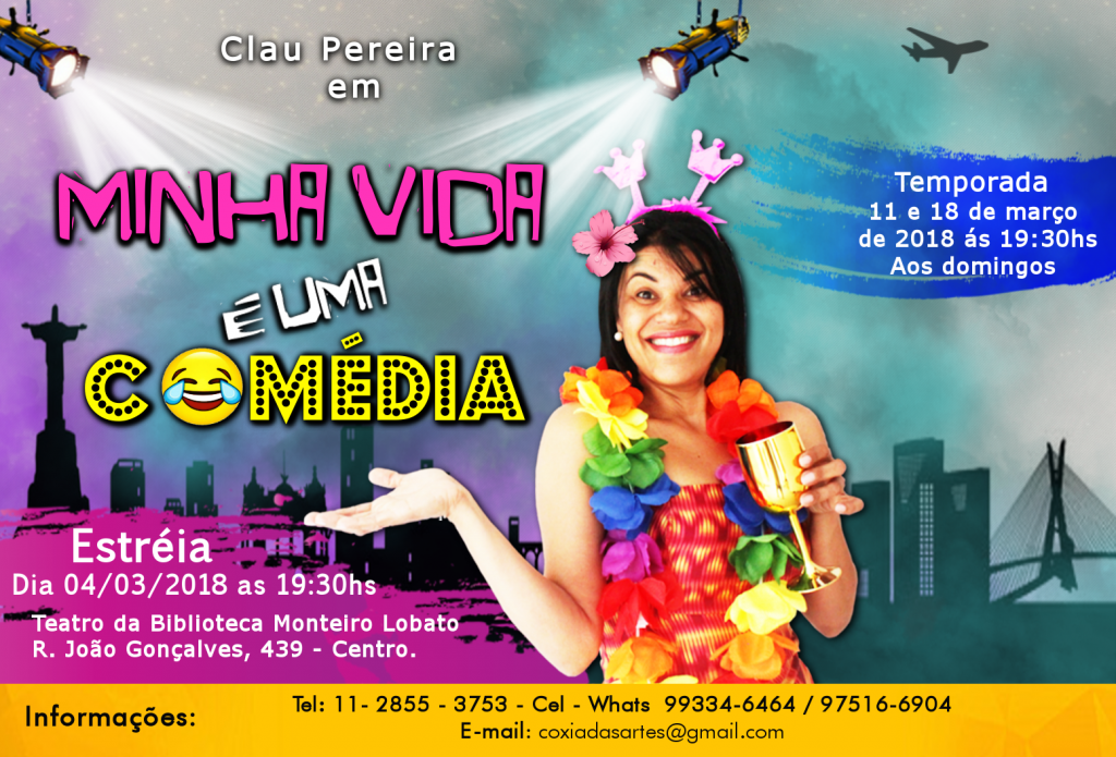 Neste domingo (04), às 19h30, o Teatro da Biblioteca Monteiro Lobato, localizado na rua João Gonçalves, n°439, Centro, recebe o espetáculo “Minha vida é uma Comédia”, interpretado pela atriz Clau Pereira. Além desta apresentação neste final de semana, a peça retorna ao teatro nos dias 11 e 18 deste mês.
