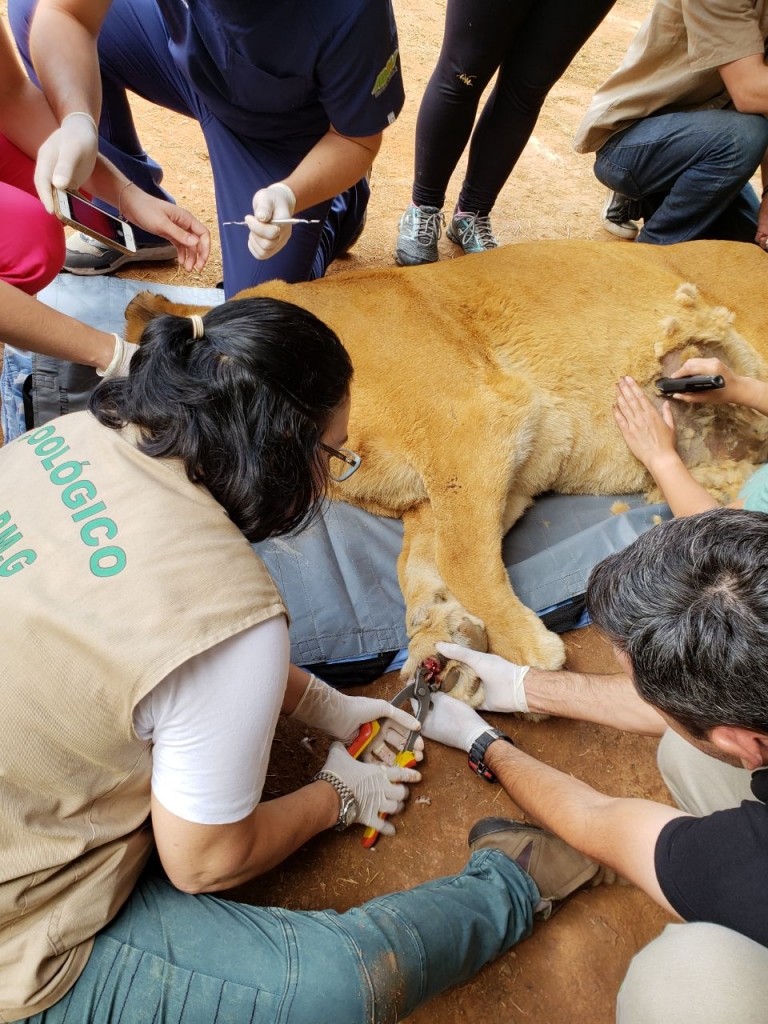 Dez profissionais, entre eles veterinários especialistas em odontologia e em exames de imagem, auxiliaram nos procedimentos realizados entre meio-dia e 13h, no próprio recinto em que a fêmea vive em companhia do leão Nero, de 17 anos.