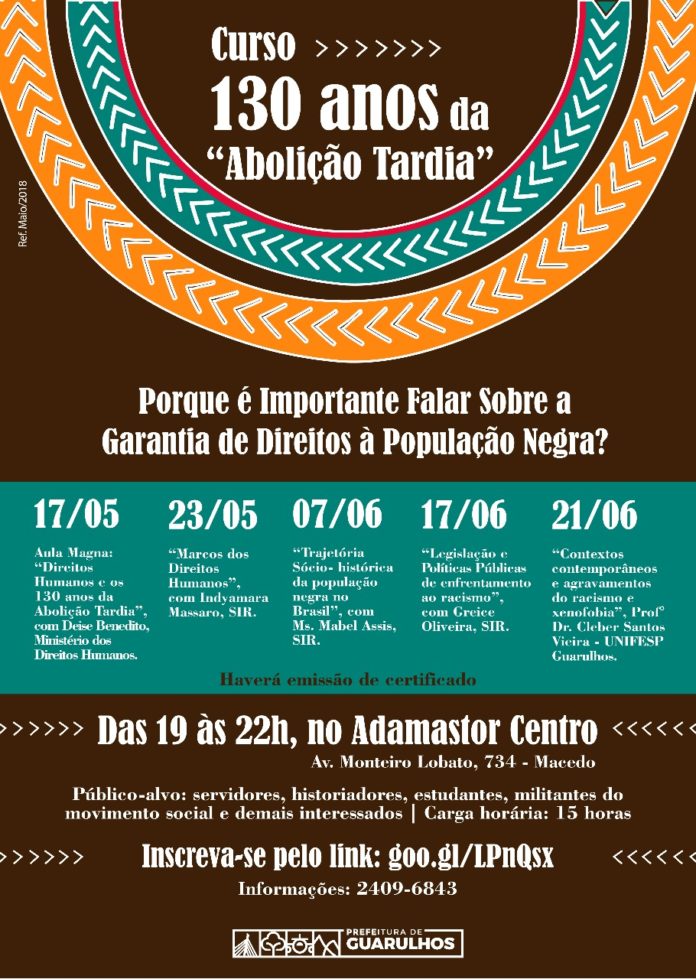 Em comemoração aos 130 anos da Lei Áurea, promulgada em 13 de maio de 1888 e que decretou a abolição da escravatura no Brasil, a Subsecretaria da Igualdade Racial, vinculada à Secretaria de Assuntos Difusos, preparou um curso para discutir os impactos do processo de escravização dos africanos para a população negra na contemporaneidade: “130 Anos da Abolição Tardia – porque é importante falar sobre a garantia de direitos à população negra”.