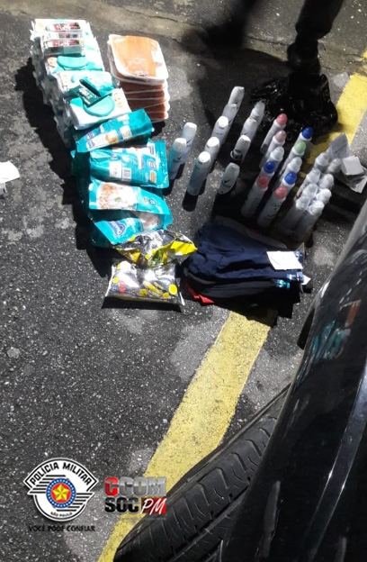 Com base nas informações, as equipes se deslocaram para o local e se depararam com o veículo e três ocupantes, sendo duas mulheres e um homem. Realizada a abordagem e durante a busca pessoal, nada de ilícito foi localizado com o trio. Já na busca veicular, foram encontrados vários produtos furtados de uma drogaria, no município de Guarulhos.