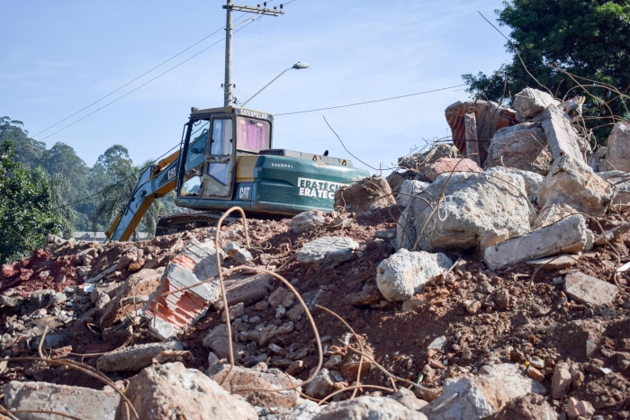 Servidores do Departamento de Manutenção e Conservação retiram manualmente materiais reaproveitáveis como madeira e ferragens e uma máquina escavadeira hidráulica carrega o caminhão com entulho para envio à Usina de Reciclagem da Proguaru, no Cabuçu. No local, o material é transformado em areia, bica e agregado reciclado para utilização em obras e serviços de conservação feitos pela Prefeitura.