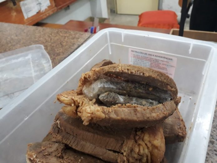 Ao passar um pote de carne no aparelho de revista Raio-X, os agentes detectaram a presença de invólucros em meio a comida. Ao checar o recipiente plástico foram constatadas substâncias semelhantes a maconha e cocaína, além de papel de seda.