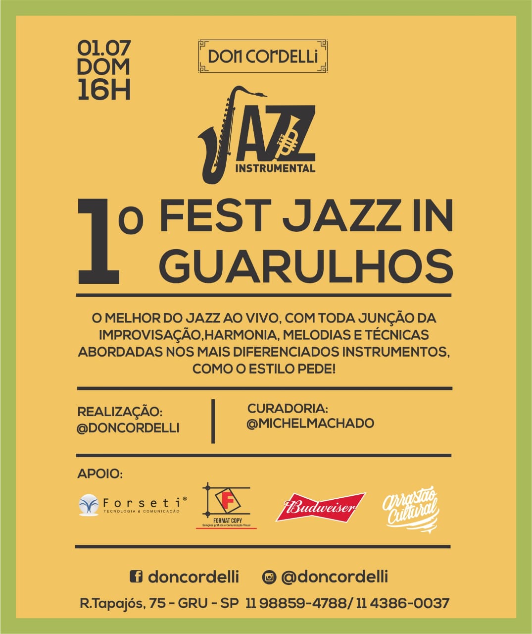 O Gastrobar Don Cordeli promove neste domingo (1) a partir das 16h, no endereço mais badalado da cidade o “I Fest Jazz In Guarulhos”. O evento recebeu inscrições de diversos grupos de música instrumental nas suas mais variadas vertentes e tem como objetivo proporcionar ao público uma experiência musical com 7 horas de programação.