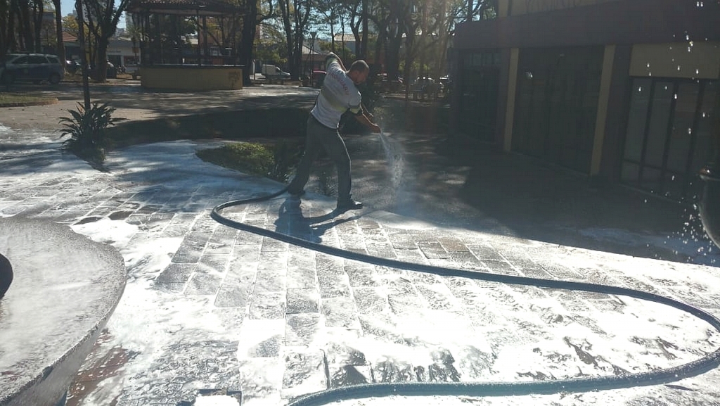 Na limpeza da praça foi utilizado um produto biodegradável que foi diluído diretamente no caminhão pipa com água de reuso. Enquanto a mistura era despejada diretamente no piso, uma equipe esfregava o chão. O produto possui PH neutro e tem a capacidade de eliminar odores do ambiente a ser limpo.