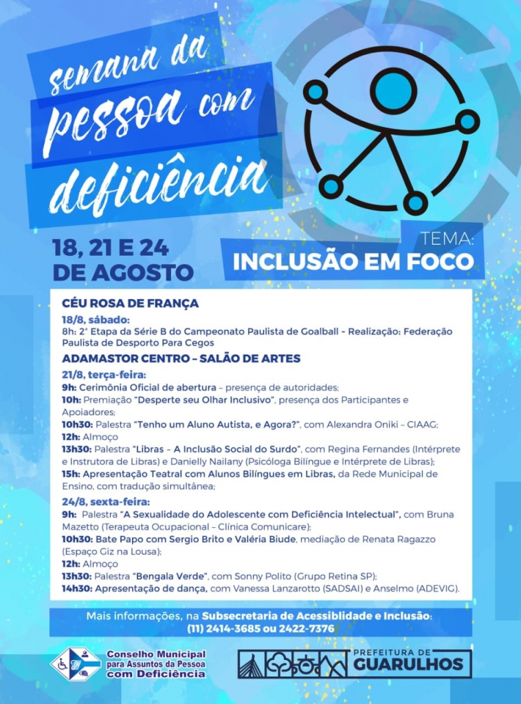 A cerimônia de abertura acontecerá na próxima terça-feira (21), às 9h, no Salão de Artes do Adamastor Centro, e várias atividades estão previstas para o dia, como palestras, teatro com alunos bilíngues em libras e a premiação do concurso “Desperte seu Olhar Inclusivo”, em que concorreram fotos depessoas com deficiência, interagindo com um atrativo turístico do município,publicadas no Instagram.