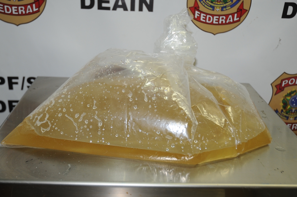 Na mala da mulher foram encontrados, em fundos falsos, dois volumes contendo um líquido turvo, na cor de mel, e uma espécie de colete, confeccionado internamente com feltro, exalando um odor muito forte. Os policiais utilizaram um lenço com reagente químico no feltro que adquiriu a cor azulada, um indicativo típico da droga cocaína.