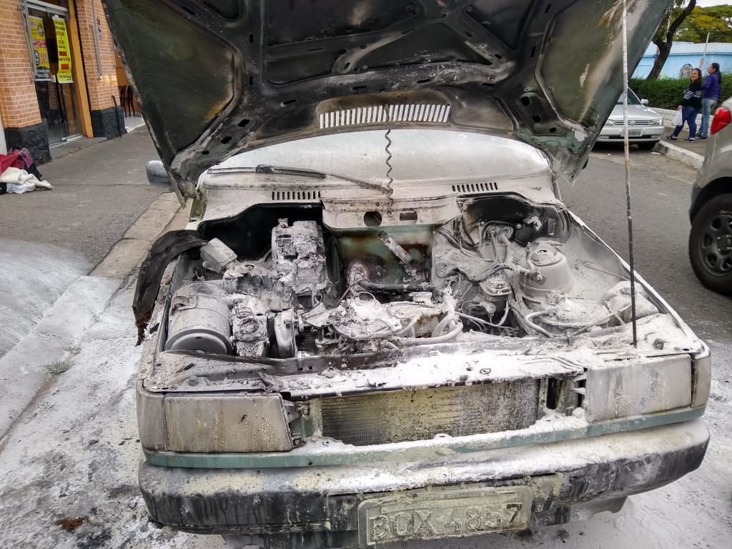 Além da ajuda de pessoas que trabalham próxima ao local, o Corpo de Bombeiros foi acionado e apagou o incêndio que atingiu toda a parte do motor do carro.