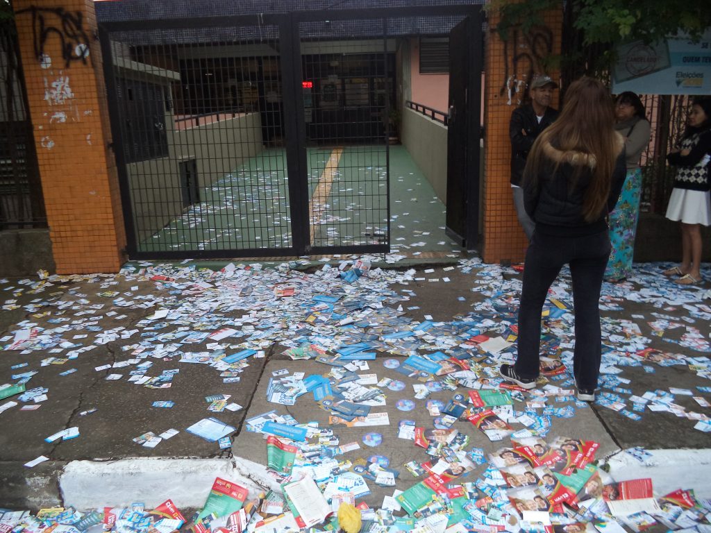 Na Escola Estadual Frederico de Barros Brotero, localizada na rua Jaiminho, n° 28, no bairro Vila Progresso, havia duas funcionárias logo na entrada realizando a limpeza na frente da escola, já que toda a calçada havia sido tomado pelos santinhos eleitorais.