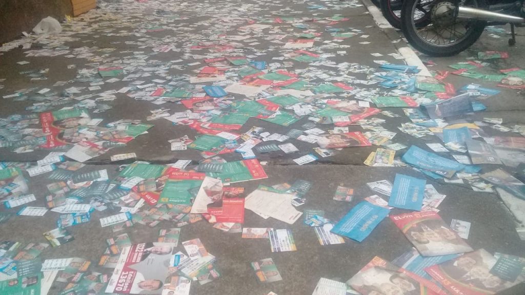 O HOJE visitou diversos pontos de colégios eleitorais da cidade e pode constatar a presença implacável dos famosos e tradicionais “santinhos” de diversos candidatos, que de acordo com a legislação eleitoral é crime e cabe multa, a ser estipulada, para quem pratica o ato e também para o candidato detentor do material.