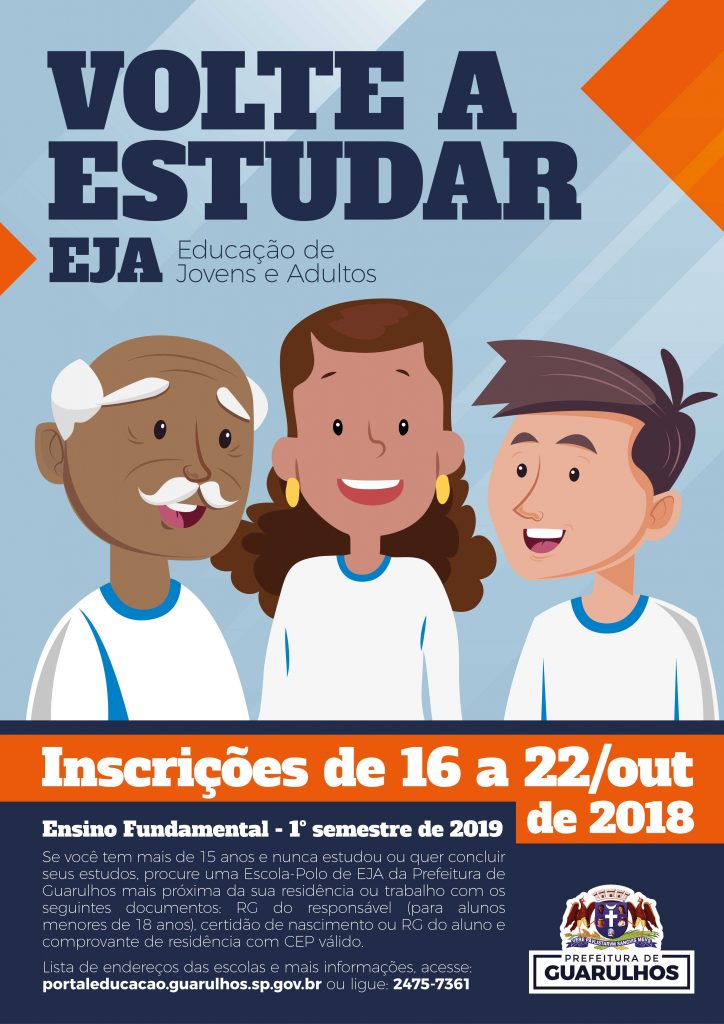 Entre os dias 16 e 22 de outubro, a Prefeitura estará com inscrições abertas para maiores de 15 anos interessados em concluir o Ensino Fundamental, do 1º ao 9º ano, na Educação de Jovens e Adultos (EJA) da Rede Municipal. As inscrições para o 1º semestre de 2019 devem ser realizadas nas escolas-polo da EJA de Guarulhos que oferecem a modalidade.