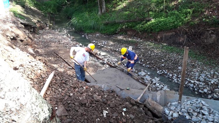 Equipe da Proguaru (Progresso e Desenvolvimento de Guarulhos S/A) continuou executando nesta quinta-feira, 18, a construção de muro de contenção, no Córrego dos Cubas, no Jardim City. A ação vem ocorrendo após o desmoronamento do talude e da pista de caminhada existente no local devido ao rompimento da galeria de águas pluviais.