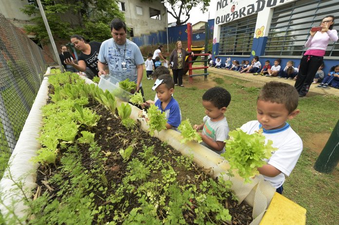 A Semana Municipal da Alimentação em Guarulhos foi encerrada nesta sexta-feira (19), com a colheita de vegetais de uma horta orgânica suspensa, implantada na telha, por alunos, de três a cinco anos da EPG Professor Milton Ziller, acompanhados da equipe técnicas de Agricultura Orgânica da Secretaria de Desenvolvimento e Assistência Social (SDAS). Os vegetais orgânicos colhidos irão compor o cardápio da refeição as crianças.