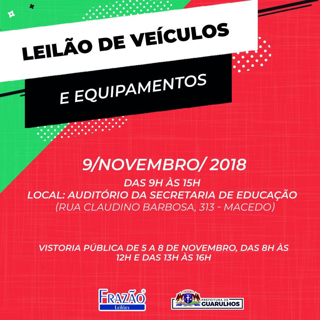 A Prefeitura, por meio da Frazão Leilões, promove leilão de bens servíveis, inservíveis e veículos em duas modalidades. O presencial, realizado no dia 9 de novembro, será no auditório da Secretaria de Educação, das 9h às 15h. A modalidade online já está disponível para lances no site www.frazaoleiloes.com.br, no qual os interessados podem acessar a relação completa dos equipamentos e veículos, fotos e condições de venda.