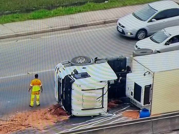 A madrugada desta segunda-feira (12) começou caótica para o motorista que trafega pela rodovia Presidente Dutra, já que às 4h50, um caminhão tombou no km 212, sentido São Paulo pela pista marginal. A carga da carreta, segundo a concessionária da rodovia, a empresa CCR Nova Dutra, é de massa de bolo, cerca de 24 toneladas.