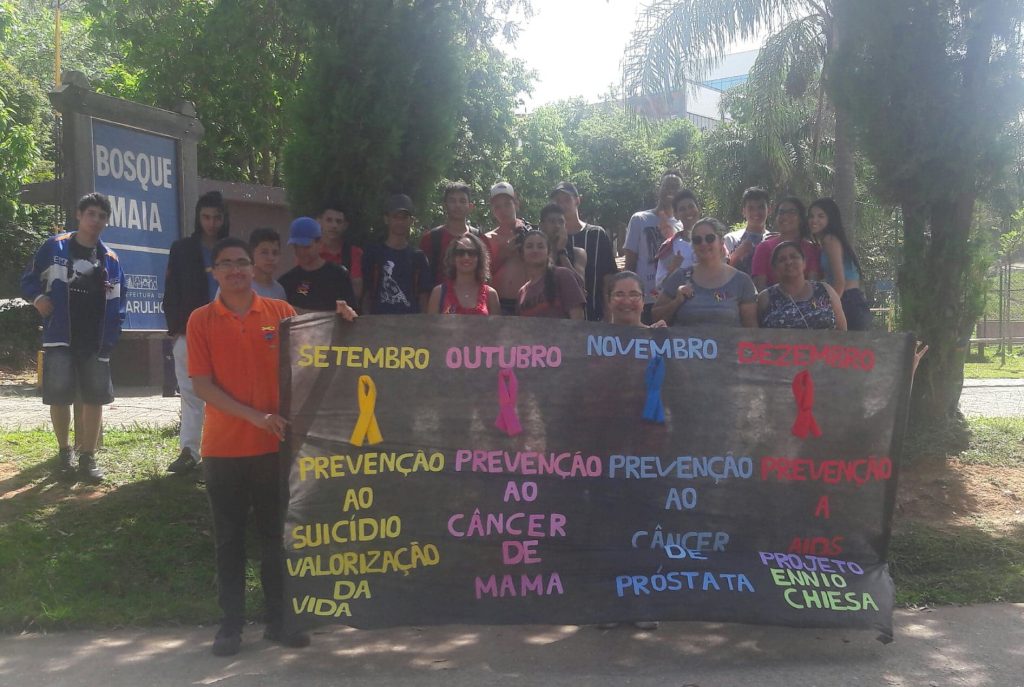 Alunos da Escola Estadual Professor Ennio Chiesa, localizada na rua Mariano Manzone, n°88, no bairro Jardim Dourado, realizaram na manhã desta quarta-feira (14), uma caminhada na região do Bosque Maia de conscientização contra o suicídio, que tem culminado com a vida de muitos jovens guarulhenses, inclusive, nesta semana, foi registrado um caso na cidade.