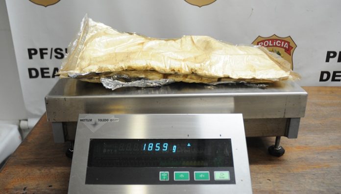 A Polícia Federal foi acionada por servidores que atuam no controle migratório, ante suspeita de que uma passageira estaria tentando embarcar com substância em pó presa nas pernas. A passageira, uma brasileira, de 38 anos, tinha como destino final Lisboa/Portugal. Após ser localizada, foi conduzida até a delegacia, onde foi feita a revista e a perícia na substância encontrada, ficando constatado que a mulher possuía aproximadamente dois quilos de cocaína presos em suas pernas.