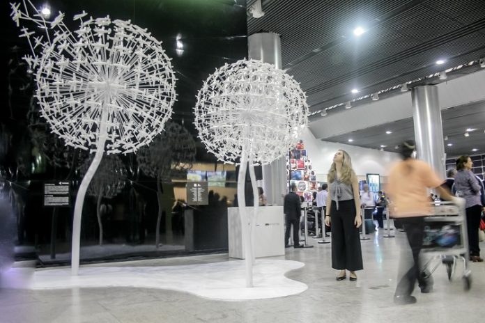 O Instituto Embraer, em parceria com o GRU Airport – Aeroporto Internacional de São Paulo, inaugurou na quinta-feira (06), a instalação artística “O primeiro sopro”, que celebra tanto a história dos 50 anos do primeiro voo do avião bimotor Bandeirante quanto da criação da própria Embraer, que completará cinco décadas de existência em 2019. Assinada por Carmela Rocha e Marko Brajovic, responsáveis pela cenografia de importantes exposições no Brasil e no exterior, a obra estará exposta até fevereiro na área de check-in do Terminal 3 do aeroporto. Cerca de 100 mil pessoas circulam pelo espaço diariamente.