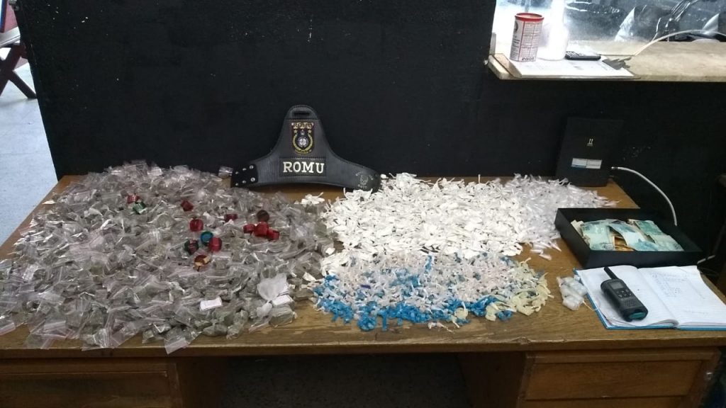 No transcorrer da ocorrência, foi constatado que na residência de um dos indivíduos funcionava um ponto de distribuição de drogas, onde localizaram mais 1.100 trouxinhas de maconha, 1.170 pinos de cocaína e 18 comprimidos de ecstasy, além de mais R$ 2.700,00.